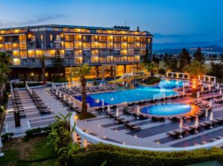 на 70 километра от летище Анталия, на 80 километра от центъра на Анталия, заема първа линия на плажа