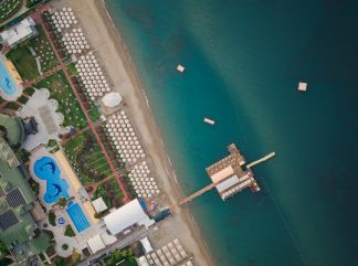 Собствен пясъчен плаж, дълъг около 200м. Шезлонги, чадъри, матраци на плажа и при басейна- безплатно. Бар на плажа-безплатно. Павилиони на плажа-платено.